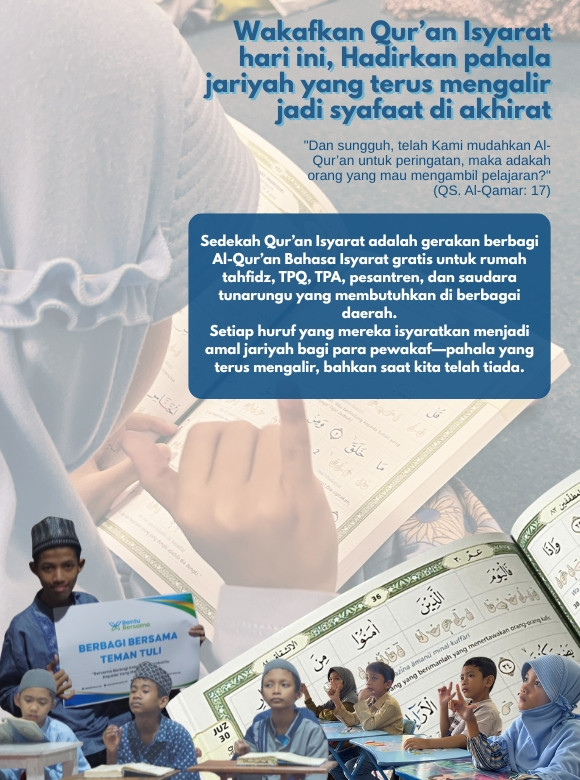 Di sinilah peran kita. Bukan hanya membantu menyediakan mushaf, tetapi membuka akses, mempercepat proses belajar, dan menguatkan generasi penghafal Qur’an dari kalangan tunarungu.