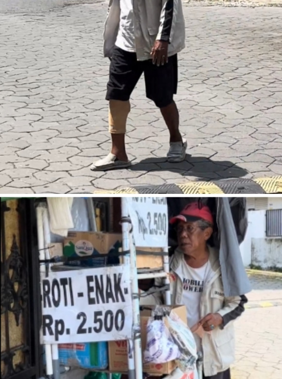 Di usia senjanya, Abah Hartono mendorong gerobak sederhana hasil modifikasi dari kereta dorong bayi menyusuri Sambisari hingga Kadirojo. Setiap pagi hingga siang, ia menjajakan roti titipan dari warga sekitar, mencoba tetap berjuang meski tubuhnya tak lagi sekuat dulu. Setelah stroke yang menimpanya di tahun 1998, kemampuan motoriknya menurun drastis tangan kanan tak bisa menggenggam kuat dan kaki kanan sering goyah. Namun justru dengan tubuh rapuh itulah Abah tetap memilih berjualan, karena baginya bertemu orang di jalan dan merasakan aktivitas kecil adalah cara untuk tetap “hidup”, bukan sekadar menunggu waktu.